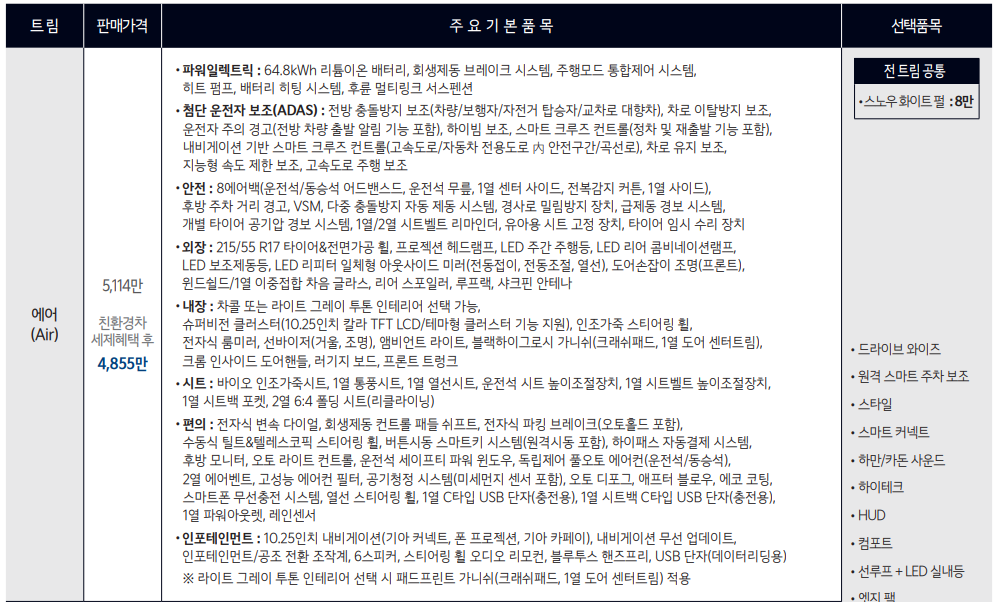 기아 니로 EV의 트림은 두가지인데 에어(Air)와 어스(Earth) 이며, 에어의 가격은 5,114만원(친환경차 세제혜택 후 4,855만원)이고 어스의 가격은 5,393만원(친환경차 세제혜택 후 5,120만원) 입니다.