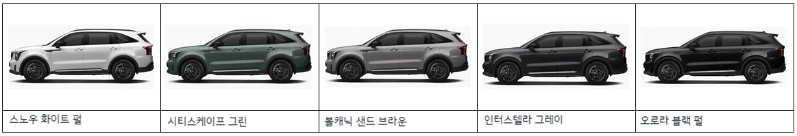 현재 이 포스팅에서는 시그니처 그래비티 트림으로 포스팅하도록 하겠습니다. 다른 트림의 가격은 추후에 업데이트 하도록 하겠습니다. 기아 더 뉴 쏘렌토 1.6 하이브리드 5인승 2WD/AT 시그니처 그래비티트림의 시작가격은 45,980,000원입니다. 외장 색상의 경우 5가지를 선택할 수 있으며 스노우화이트펄만 80,000원이 추가 됩니다.