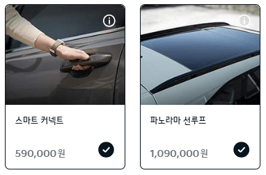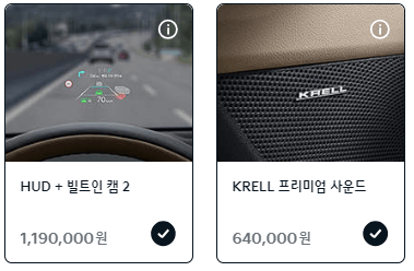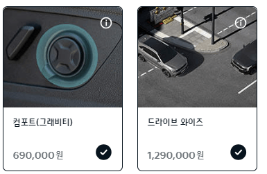선택옵션의 경우 컴포트(그래비티)[690,000원], 드라이브와이즈[1,290,000원], HUD+빌트인캠2[1,190,000원], KRELL 프리미엄사운드[640,000원], 스마트 커넥트[590,000원], 스마트 커넥트[590,000원], 파노라마선루프[1,090,000원]이 있습니다.