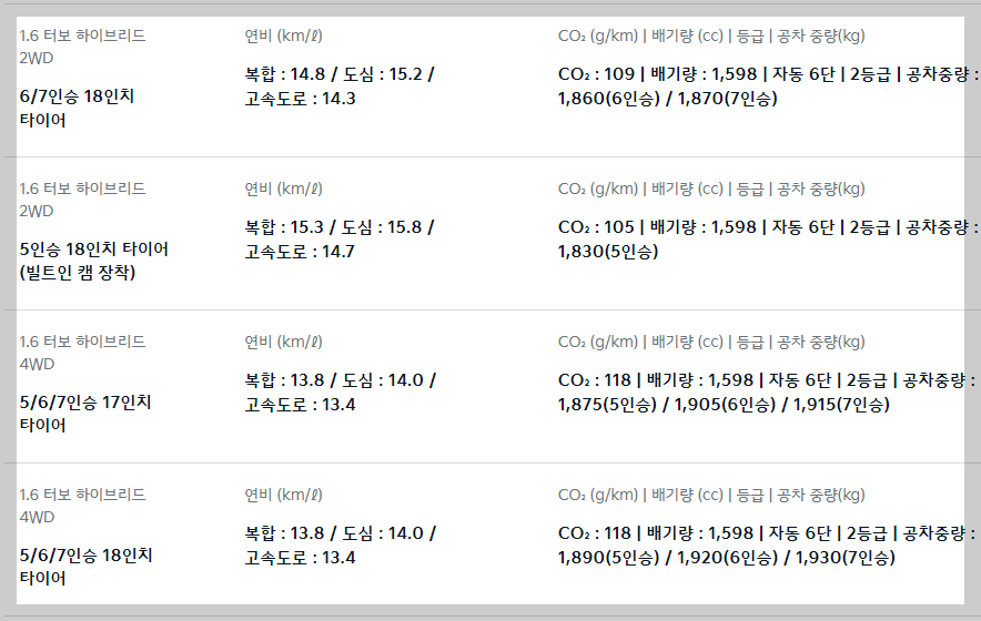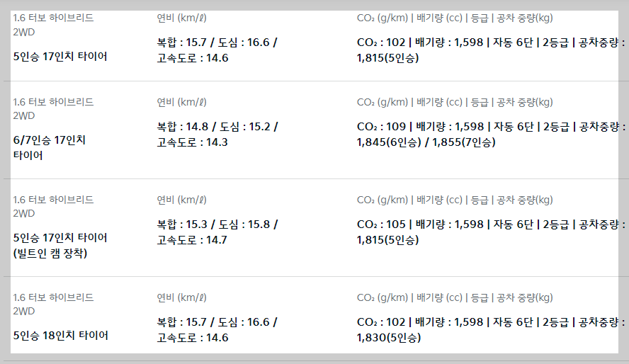 정부인증 공인연비는 아래 사진을 확인하세요[1.6 하이브리드 기준]