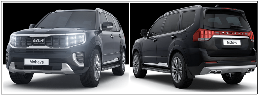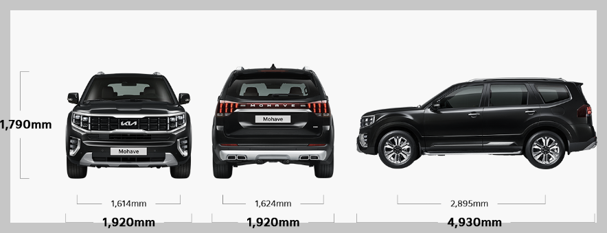 기아 모하비는 탄탄한 등판과 강인한 이미지를 전면부 디자인에 투영시킵니다. 굵직한 그릴과 인상적인 LED 헤드램프는 차량의 명확한 존재감을 더하며, 21년식에 비해 23년식으로 오면서 KIA의 로고를 바꾸어 더욱 세련되고 고급스러운 전면부를 확인 하실 수 있습니다. 전체적으로 날렵한 측면 실루엣이 모하비의 독특한 선을 완성합니다. 후측면은 활력 넘치는 LED후미 램프와 강렬한 크롬 배기구로 마무리 되어 있으며, 전후 바퀴관리 커버와 사이드 발판 등 세심한 셉 디자인이 돋보입니다.