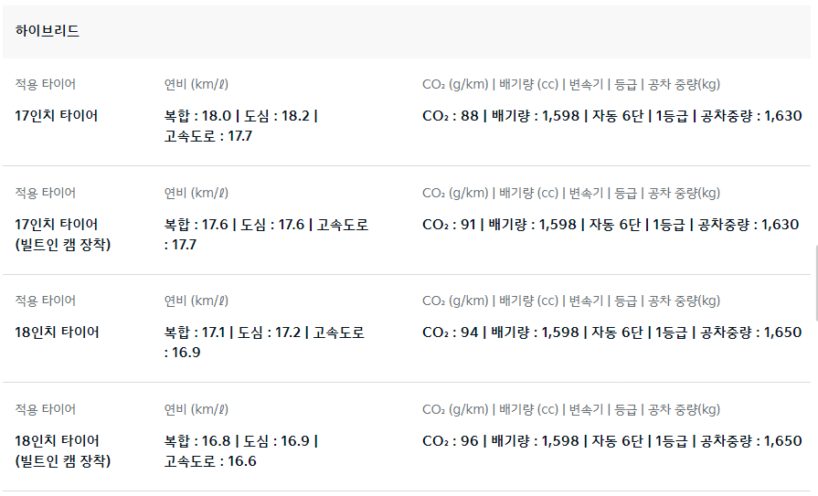 1.6 터보 하이브리드의 정부신고 연비 및 등급은 아래 사진을 참고 해주세요[2.5가솔린 및 3.5가솔린은 카탈로그 22쪽 참고]
