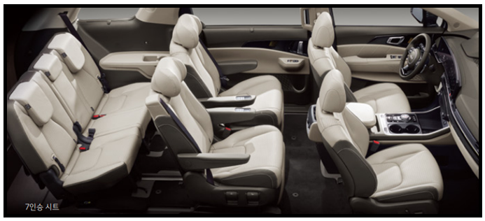 1열/2열 열선시트, 1열/2열 통풍시트, 1열 파워시트, 동승석 워크인 디바이스, 운전석 4WAY 전동식 허리지지대, 2열 프리미엄 릴렉션 시트(원터치 릴렉션 모드, 파워 리클라이닝, 파워 레그서포트, 윙타입 헤드레스트, 전/후/좌/우 슬라이딩), 3열 6:4 싱킹 시트(리클라이닝), 나파 가죽시트, 운전석 에르고 모션 시트, 2열 시트벨트 버클 조명