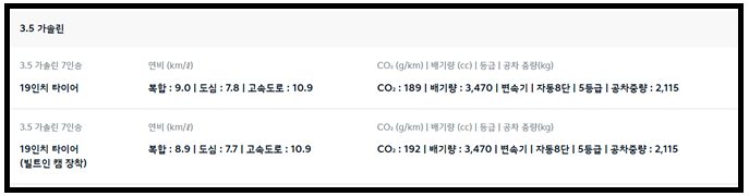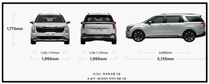 이 차량의 연비는 19인치(7인승) 기준으로 복합 9.0km/l를 보여주고 있으며 도심에서는 7.8km/l, 고속도로에서는 10.9km/l로 다소 아쉬운 연비를 보여주고 있습니다. 차량의 크기도 클뿐만 아니라 연진도 3.5 가솔린을 쓰기 있기 때문입니다. 이차량의 크기는 아래 사진을 참고 해주세요.