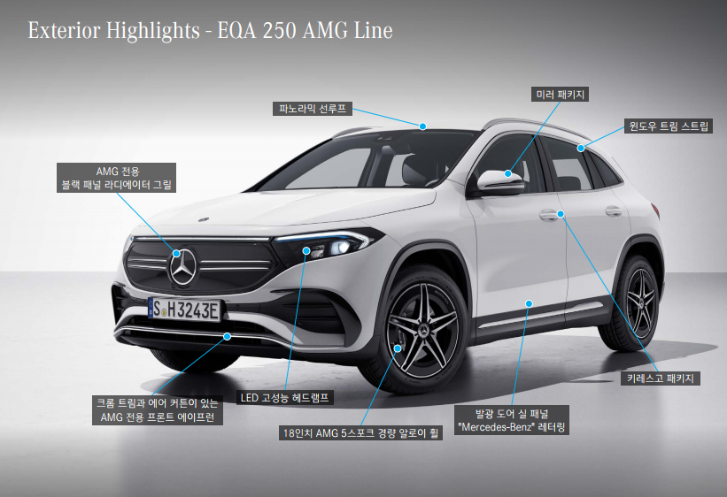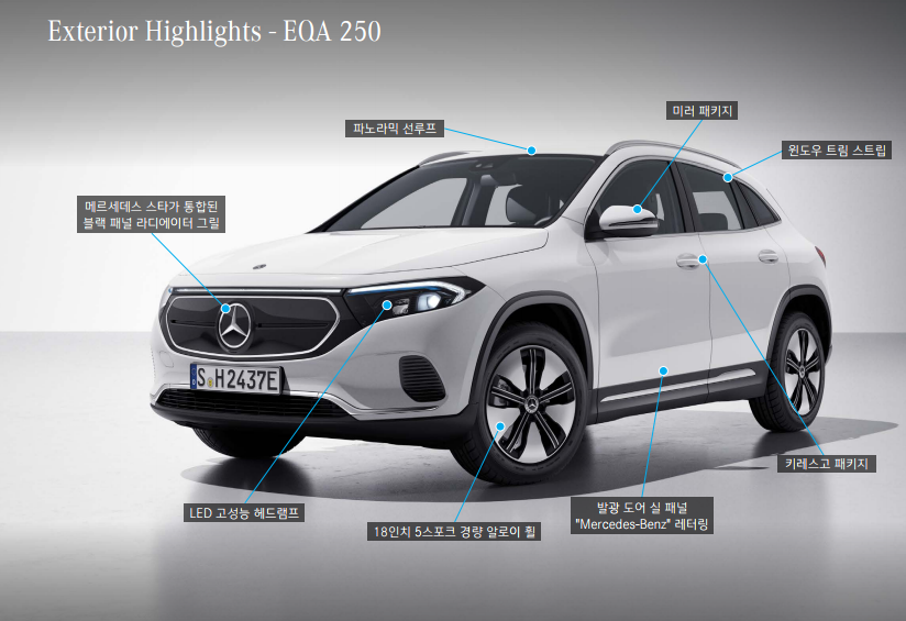 벤츠 EQA는 전기차 전용모델이 아닌 내연기관 모델인 GLA를 전기차로 개조한 모델입니다. 전면에는 메르세데스 스타가 통합된 블랙패널 라이에이터 그릴이 있고, LED 고성능 헤드램프가 눈에 들어옵니다. 측면부는 5스포크 경량 알로이 휠이 눈에 들어옵니다. 후면부는 리어램프가 일자로 이어져있습니다.