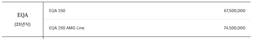 벤츠 EQA의 경우 두가지 선택이 가능하며, EQA 250 모델과 EQA 250 AMG Line 입니다. 각각의 가격은 67,500,000원과 74,500,000원입니다. 2022년의 경우 기본모델이 5990만원으로 저렴한가격이었는데 1년사이에 가격이 많이 올라버렸네요.