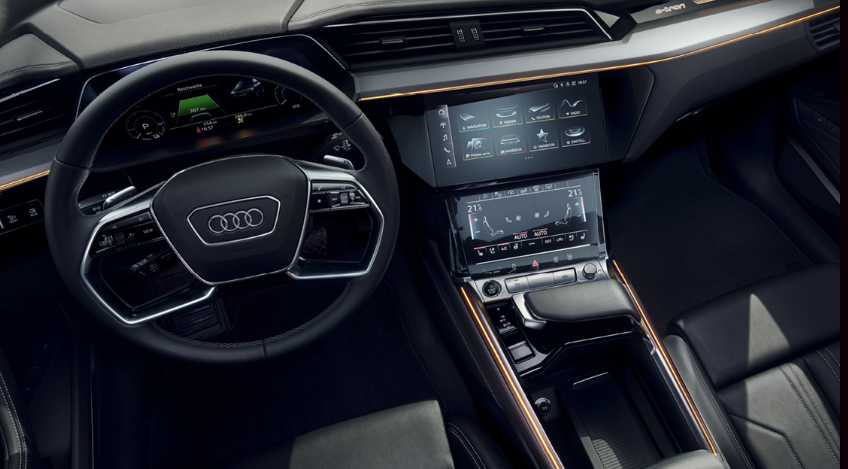 실내 디자인은 운전자와 탑승자 모두가 편안한 여정을 느낄 수 있도록 공간에 여유를 더 했습니다. 안락함을 더 해주는 발고나 가죽시트와 고급스러운 마감은 보다 높은 품격을 보여줍니다. 넓은 레그룸으로 느껴지는 여유로운 뒷자석 공간은 4-zone 자동 에어컨으로 개별 온도 제어가 가능하며, e-tron에 장착된 프리미엄 에어패키지는 이오나이저와 에어필터를 통해 차량내의 공기질을 개선하여 쾌적한 실내공간을 연출합니다.