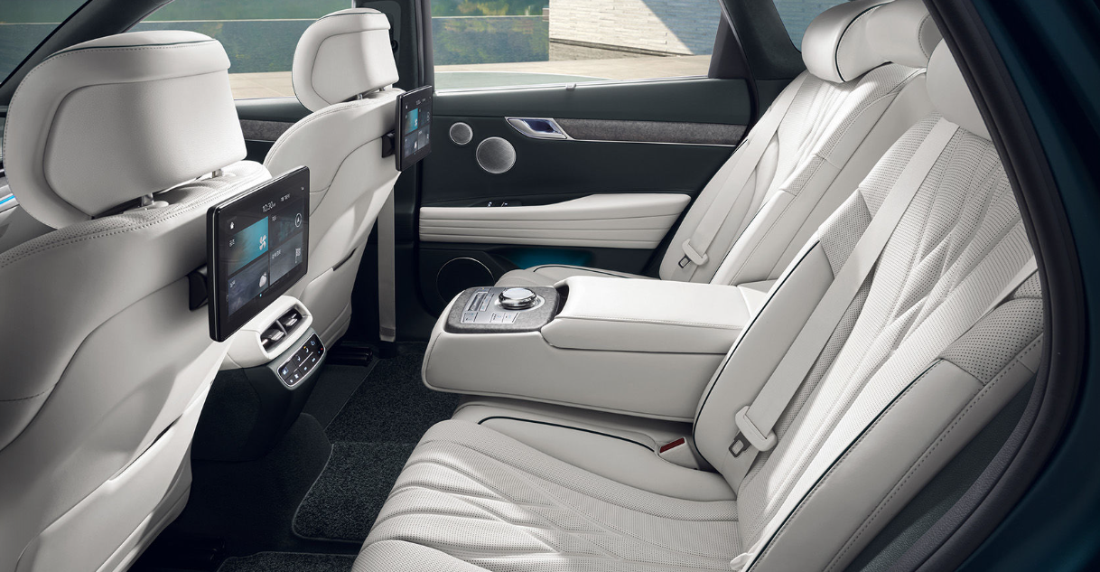 실내디자인적 특징인 천연염료 나파 가죽 시트가 적용되었고, 전면부에 포지드 우드 가쉬쉬를 더해 지속 가능한 럭셔리라는 제네시스 브랜드의 방향성을 보여줍니다. 또한, 제네시스 브랜드하면 여백의 미를 강조를 하는데 새로운 컬러인 다크 라군그린과 글레이셔 화이트 투톤을 더해 시각적 여유로움을 더했으며, 무드등이 적용된 전자식 변속 다이얼로 고급스러운 이미지를 연출합니다.
