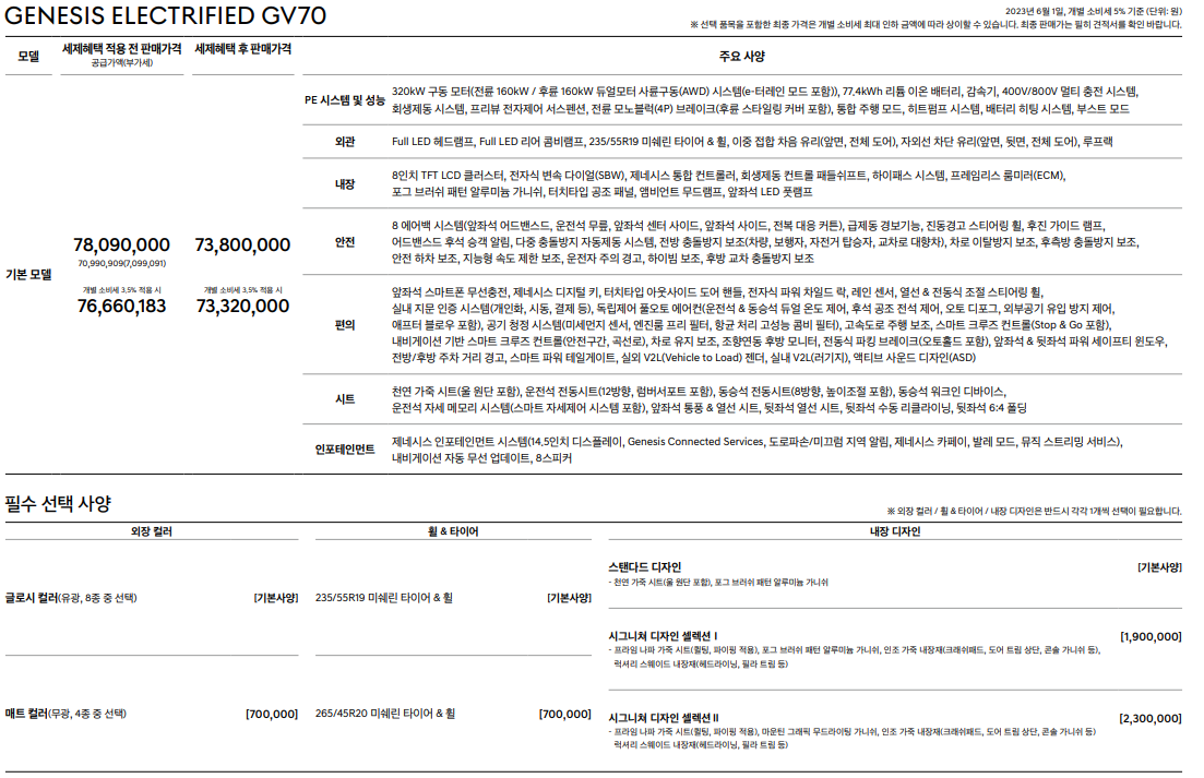 제네시스 GV70 전기차는 기본적으로 사륜구동(AWD) 시스템이며, 시작가격은 73,320,000원입니다.