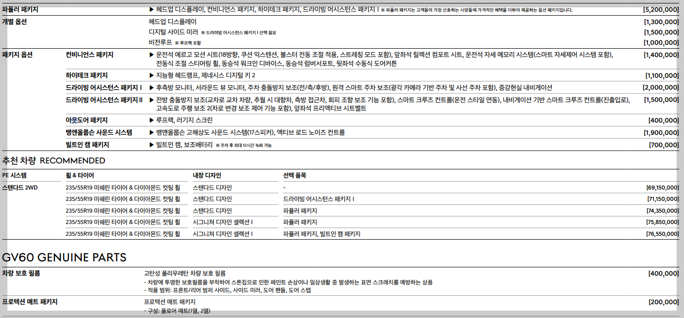 프리미엄 전기차인 GV60의 경우 현대와기아의 E-GMP 플랫폼기반의 전기차인 아이오닉5와 EV6의 가격보다 약 1,000만원정도 더 비싼 가격에 판매하고 있습니다. GV60의 트림은 3가지로 나뉘며, 시작가격은 스탠다드 2WD 6,493만원(168kw), 스탠다드 AWD 6,843만원(234kw), 퍼포먼스 AWD 7,413만원(360kw) 입니다.