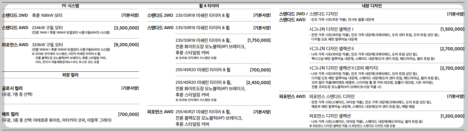 - 전기모터 최고출력 : 360kw(퍼포먼스 AWD 부스트 모드 기준)