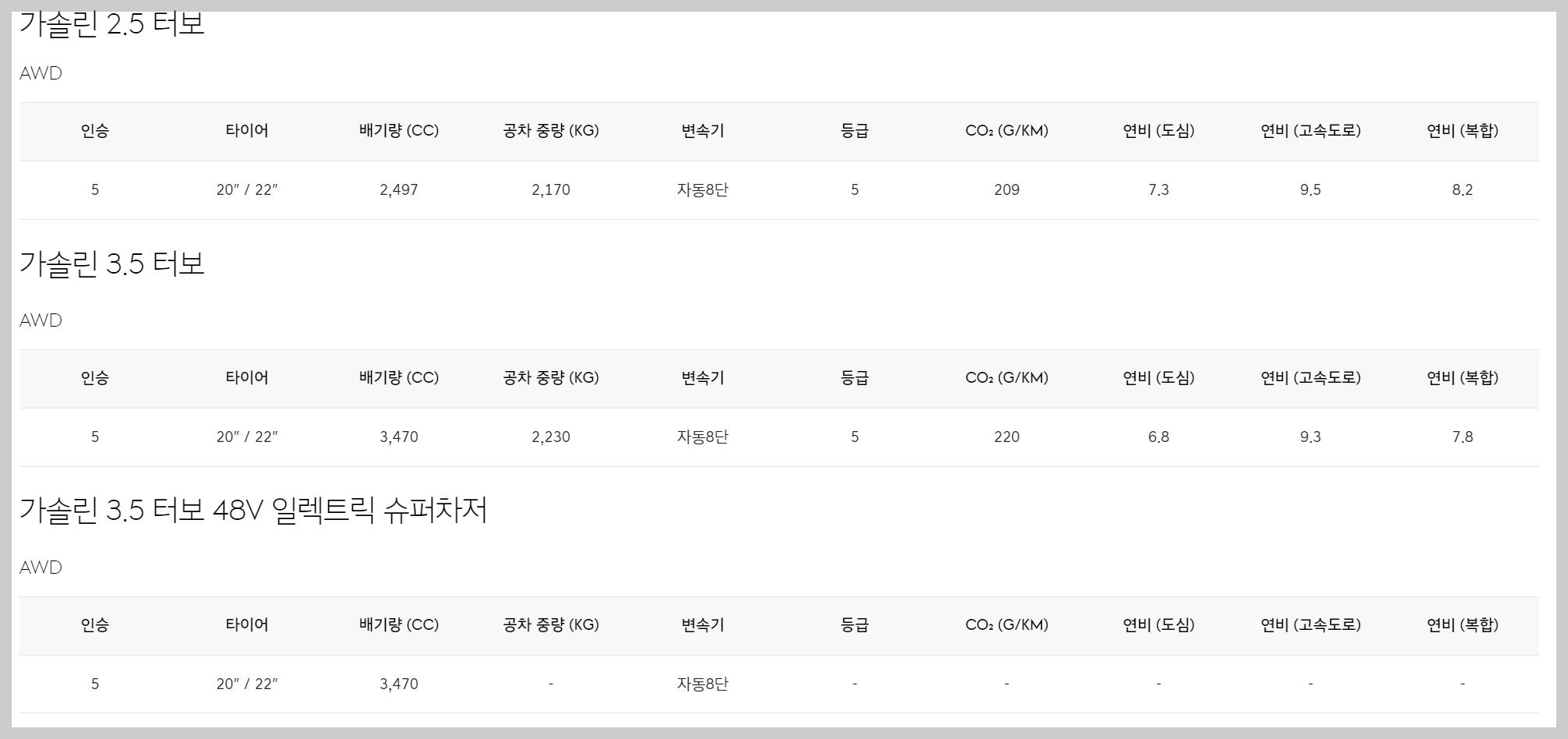 가격분석에 앞서 이 차량은 엔진이 3가지의 경우로 나뉘기 때문에 엔진에 따라서 가격을 분석해 보도록 하겠습니다.