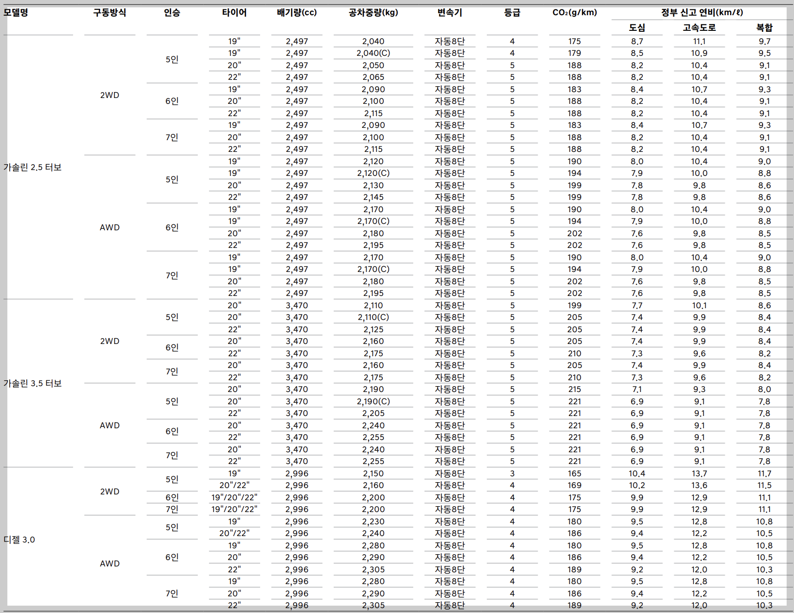 디젤 3.0의 경우 273PS 최고출력을 가지고 있고 60kgf.m의 최대토크를 가지고 있습니다. 디젤의 경우 출력이 낮은 대신에 토크가 가솔린 차량보다 크다는 장점이 있습니다. 복합연비는 11.7km/l(2WD 5인승, 19인치기준)으로 가솔린 차량보다는 높은 연비를 보여주고 있습니다.