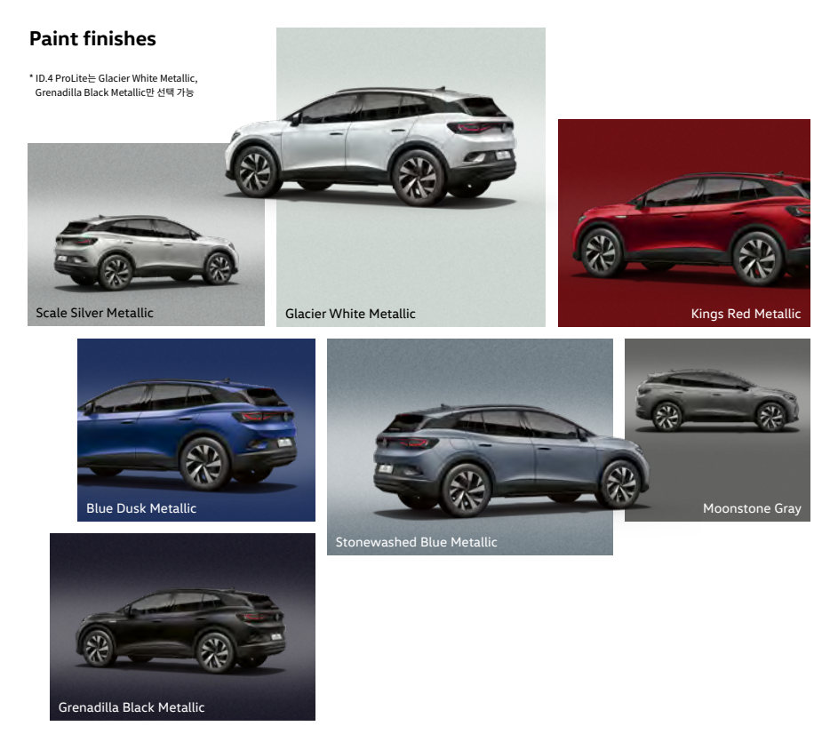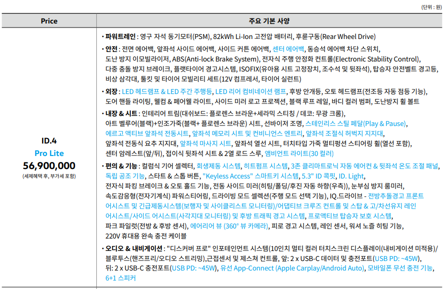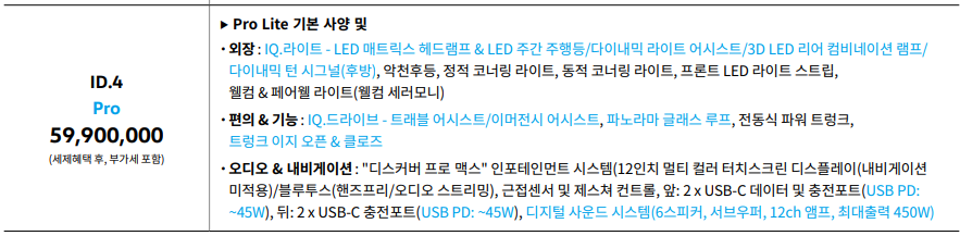 ID.4의 트림은 두가지로 나뉘게 되는데, Pro Lite(56,900,000원[세제혜택 후])와 Pro(59,900,000원[세제혜택 후]) 입니다. 두 트림의 차이는 Pro에서 외장과 편의&기능, 오디오&내비게이션의 차이를 가지게 됩니다.