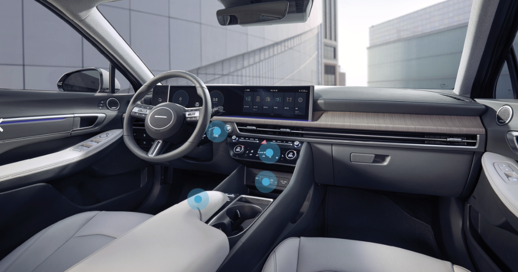 실내디자인에서 특징적인 부분은 하이테크한 파노라믹 커브드 디스플레이와 간결한 실내 디자인은 탑승자에게 만족감을 선사합니다. 커브드 디스플레이에는 현대의 차세대 인포테인먼트 시스템이 들어가 있으며 서라운드 뷰, 음성인식, 미디어 스트리밍, 실시간 길 안내 등의 다양한 콘텐츠를 제공합니다. 또한, 보스 프리미엄 사이드 스피커가 12개 들어가 있어 풍부한 음량을 즐길 수 있습니다. 뒷면에는 전동식 커튼이 적용되어 후면 유리를 통해 들어오는 햇볕을 차단 하는 기능 있으며, 후진시 자동으로 커튼이 내려가 후방 시야를 확보할 수 있습니다.