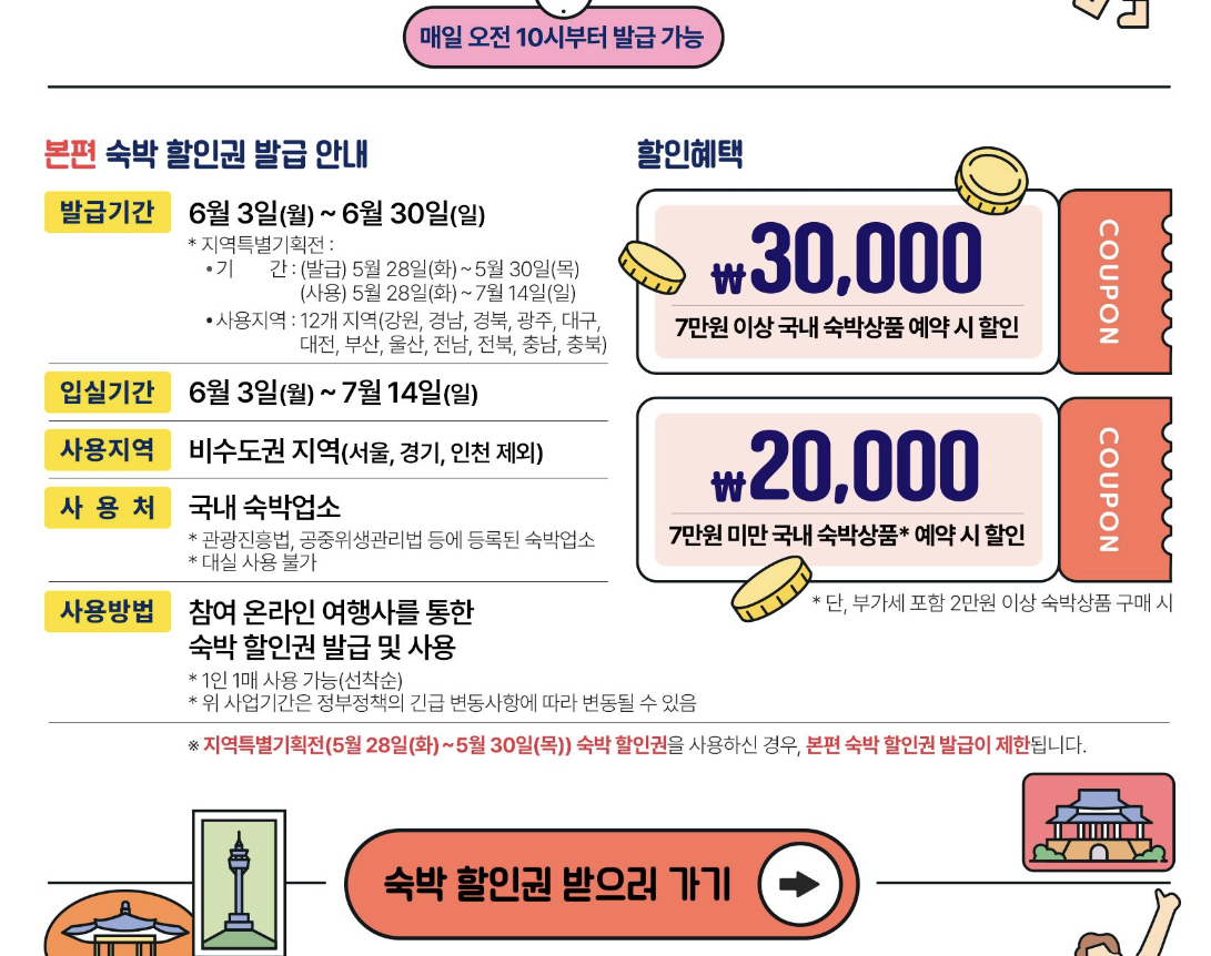- 서울, 경기, 인천을 제외한 모든 비수도권 지역에서 사용 가능한 숙박 할인권 제공
